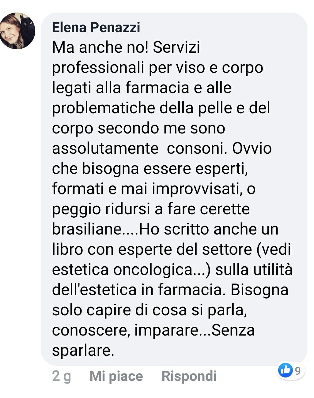 Io non vorrei essere categorica o troppo selettiva, ma penso anche che occorra capire di che cosa si parla prima di voler eliminare qualcosa che invece a mio modo di vedere richiama un vuoto nella nostra categoria. Noi farmacisti siamo chiamati ad aiutare i nostri clienti/pazienti in modo nuovo, visionario e a volte controcorrente. Una estetica mirata, che ripeto sia collegata direttamente alle problematiche per cui i nostri clienti arrivano in farmacia, secondo me riempie quel vuoto di cui vi parlavo.
